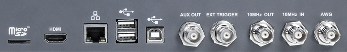 支持 2 个 USB Host 3.0 和 2 个 USB Host 2.0、1 个 USB Device 2.0 (USBTMC)、1 个 1000M LAN(VXI-11/Telnet/Socket)、1 个micro SD 卡、1 个辅助输出(Pass/Fail 和 Trigger Out 复用)、1 个 HDMI 视频输出接口、1 个 10 MHz In 和 1 个 10 MHz Out。