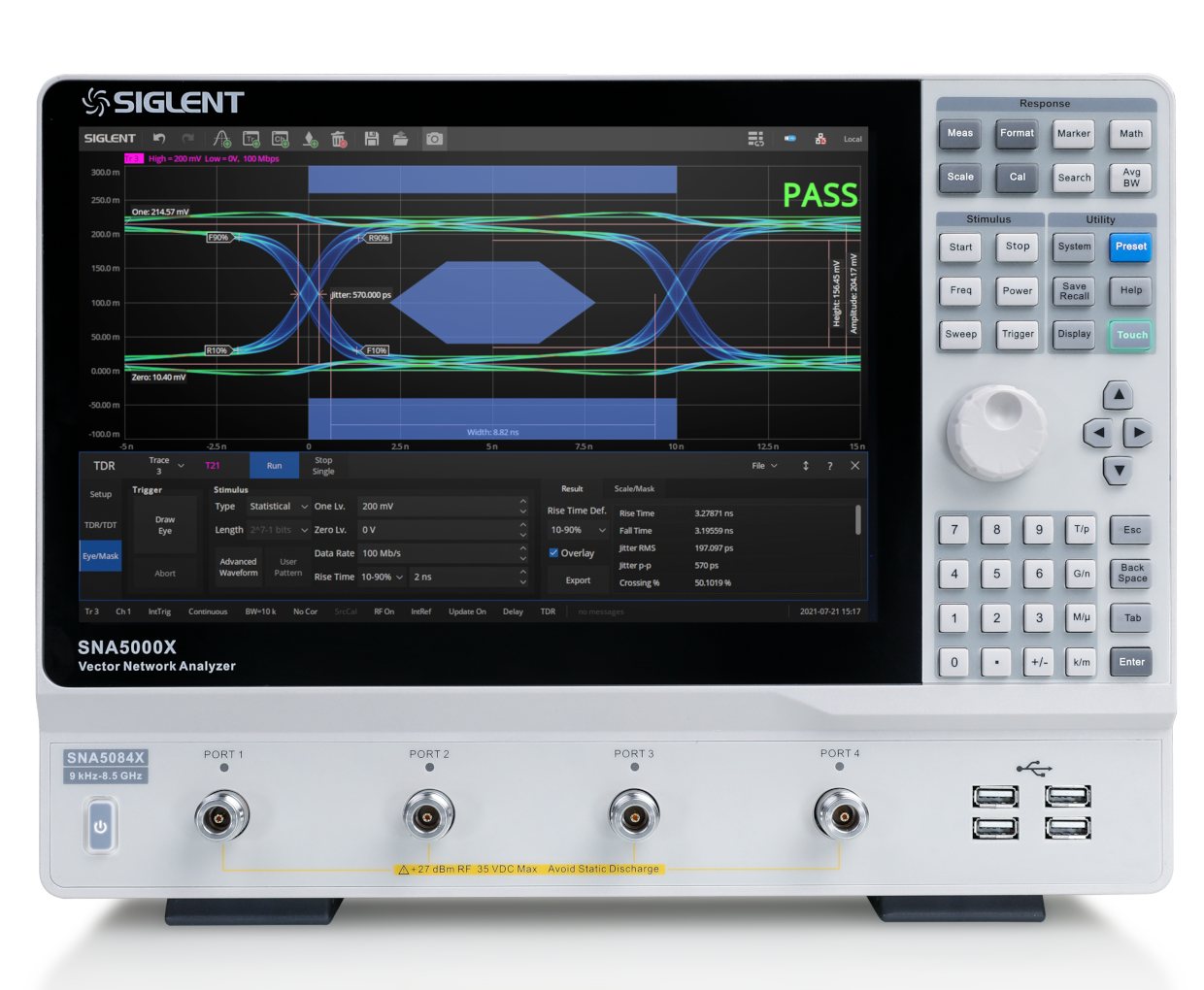 简单介绍:鼎阳SNA5000X系列覆盖9kHz~8.5GHz频段,具备125dB动态范围和0.05dB幅度精度,支持4端口S参数、差分平衡测量及TDR时域反射分析。集成眼图功能、夹具去嵌和SOLT/TRL校准,12.1英寸触控屏适配研发/产线场景,适用于滤波器、天线及高速信号完整性测试。