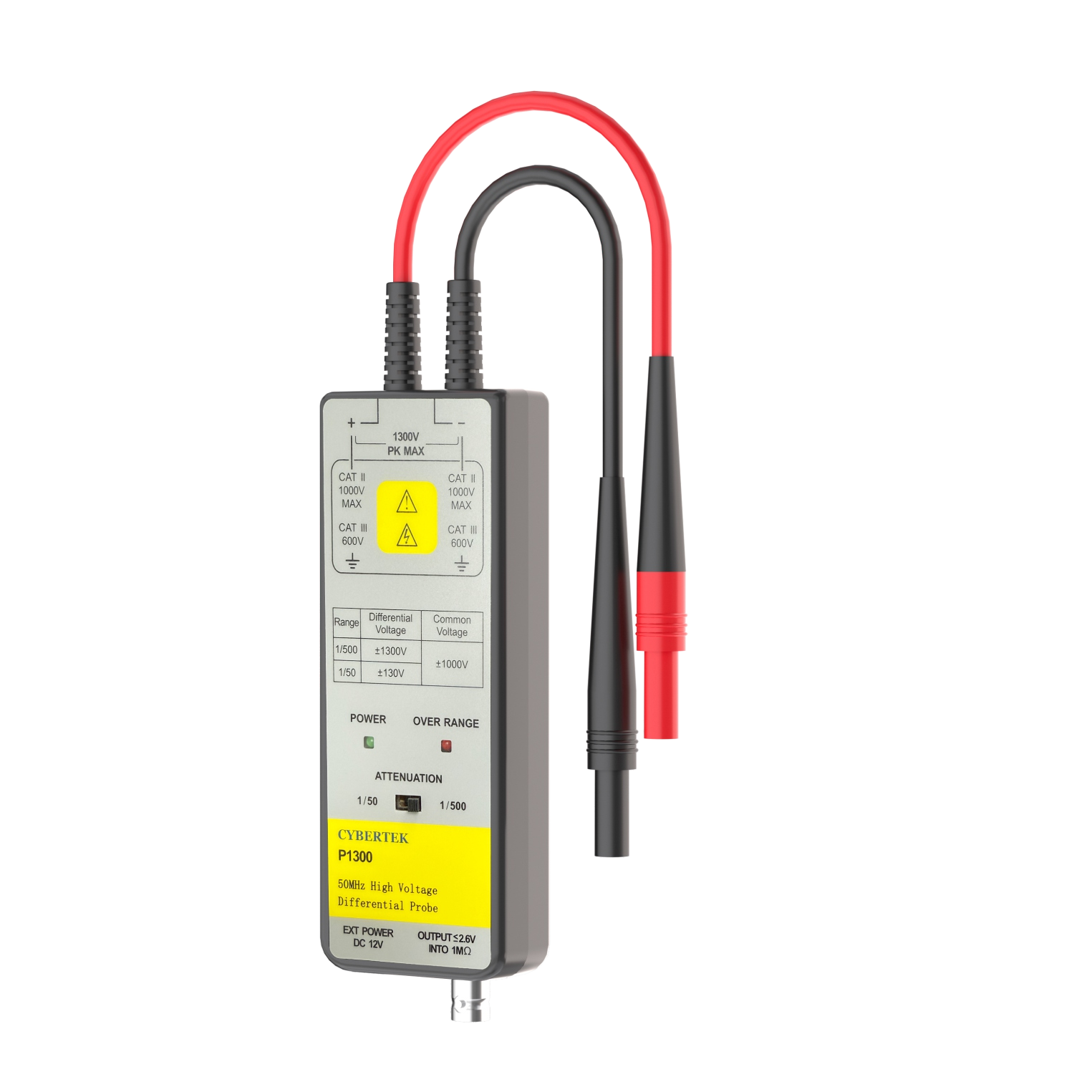 简单介绍:知用P1300系列高压差分探头,支持±1300V差分电压测量,50MHz带宽精度±2%。具备双量程(50X/500X)、过载声光报警、BNC接口通用适配,输入阻抗10MΩ/电容<2pF,通过CAT III 600V安全认证。适用于变频器、开关电源及电力电子测试。
